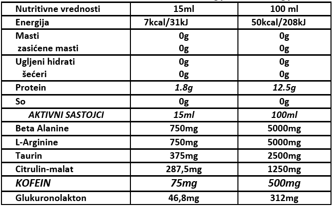 Pakovanje: 80 ml. Preporučena upotreba: 3 kafene kašičice na dan (15 ml) 20 min. pre vežbanja. Ne prekoračiti dnevnu dozu. Sadrži kofein.