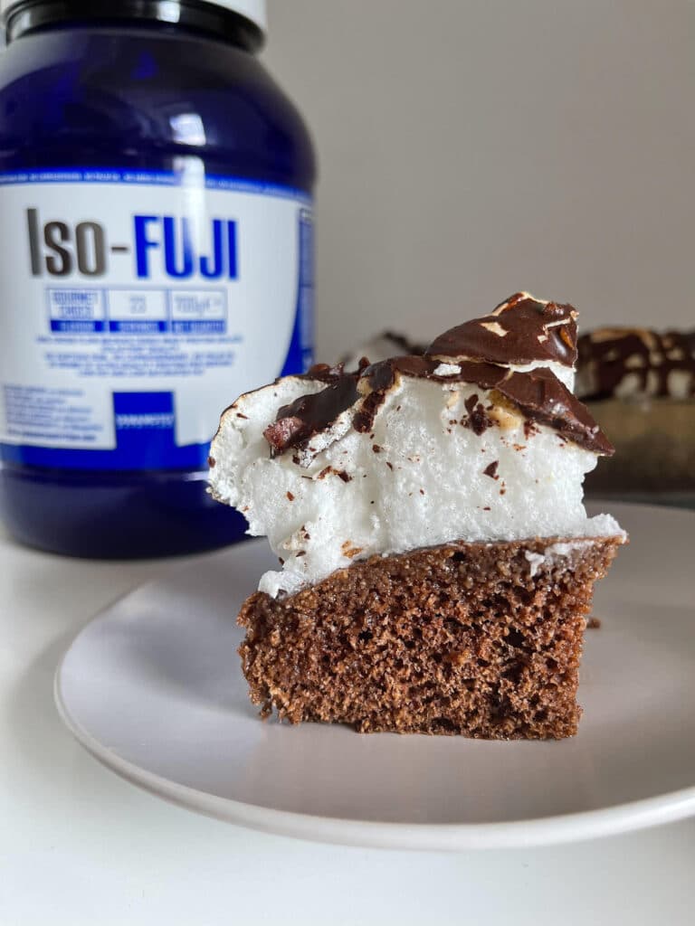 - Obložiti pleh za pečenje pek papirom. Uključiti rernu na 200°C. Dok se rerna zagreva, pravimo biskvit. Mikserom izraditi žumance i eritritol (koji smo prethodno samleli u prah), pa dodati sve sastojke osim brašna i praška za pecivo i sjediniti sve zajedno. Nakon toga dodati brašno i pzp i sjediniti kašikom/špatulom. Kolač izliti u pleh za pečenje.
