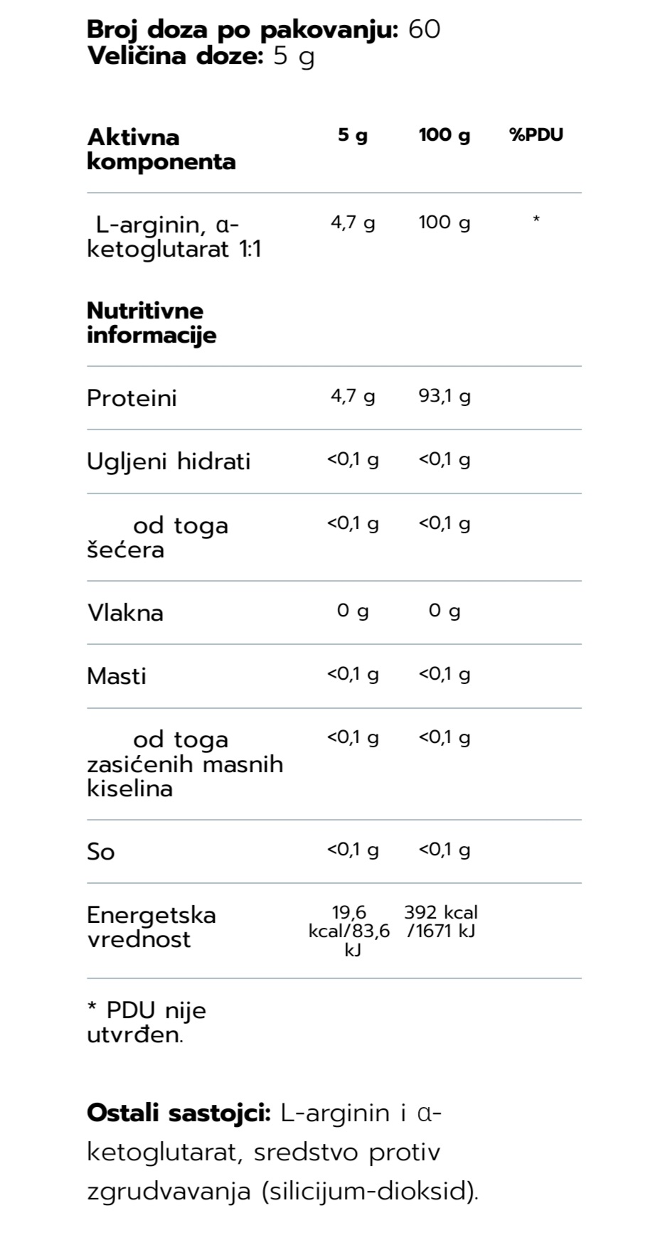 Pakovanje Arginine AAKG: 300 grama. Preporučena upotreba: Sadržaj 1 dozirne merice (5 g) rastvoriti u 200 ml tečnosti, promućkati dok se ne rastvori. Popiti 1-2 puta dnevno ili po potrebi.