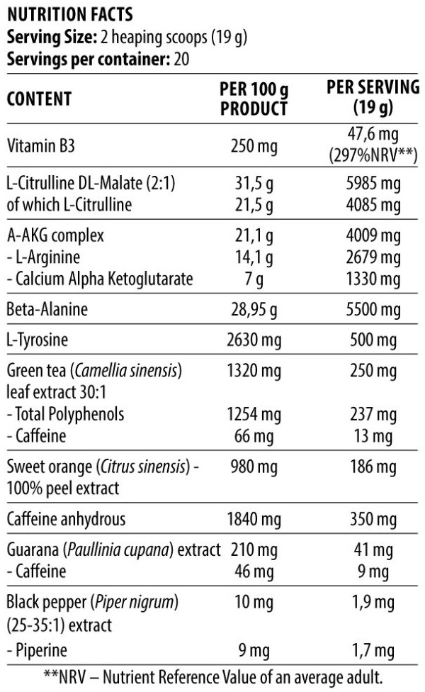 • 6000mg Citrulin malata za eksplozivnu mišićnu pumpu i poboljšane performanse• 5500mg Beta alanina za produženu mišićnu izdržljivost• 4000mg Arginina AAKG za povećanu snagu• 500mg L-Tirozina za jačanje mind&muscle konekcije• 350mg Kofeina za povećanu koncentraciju i energiju• Vitamin B3 i 3 prirodna ekstrakta za povećanje neverovatne energije i smanjenje umora