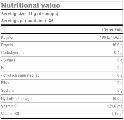 Vitamin C dodatno poboljšava apsorbovanje i sintezu kolagena. U ovoj verziji, kolagen direktno utiče na jačanje i obnovu ćelija vezivnih tkiva, ligamenata, kostiju, zglobova i tetiva, ali deluje i na regeneraciju kose, kože i noktiju.
