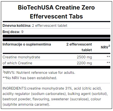 Creatine šumeće tablete sadrže 0g ugljenih hidrata i 0g masti. Svaki gram šumećeg kreatina jednako je 3g redovnog kreatina u prahu. Sa ovim preparatom možete zaboraviti na stomačne probleme povezane sa uzimanjem kreatina.