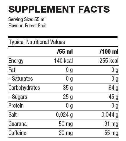 Pakovanje: 55 ml Sastojci: Glukozni sirup, voda, izomaltuloza (palatinoza), fruktoza, acidiferi (limunska kiselina, jabučna kiselina), pogodnost, zgušnjivač (ksantan guma), guarana, konzervans (kalijum sorbat), so, kofein.