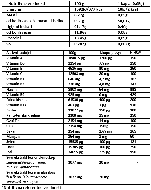 Ovaj dodatak ishrani je all in one blago koje vam omogućava da na najbolji način upotpunite nedostatke hranljivih materija u vašoj ishrani. Laki su za varenje i obezbeđuju dnevne minerale i vitamine idealne za povratak u formu i bavljenje napornim danima. Pored toga, sadrži ginseng, biljku koja pomaže u stimulisanju muškosti kod muškaraca, pored poboljšanja fizičke izdržljivosti. Ovaj dodatak je idealan svakodnevni pratilac koji vam daje osećaj snage i blagostanja.