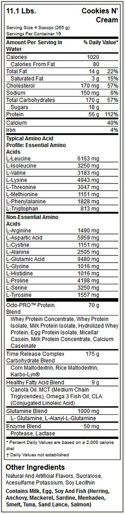 Bogatstvo ultrakvalitetnih kalorija i 56 g proteina iz multikomponentnog blenda u svakom serviranju garantuju brzu izgradnju mišićne mase i snage.