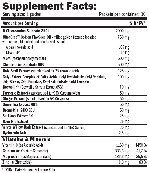 Osteo-Flex Amix je kompletan proizvod za zaštitu zglobova, tetiva i kostiju, specijalno dizajniran za sportiste sa najvećim potrebama. Takodje sadrži velike doze glukozamina, hondroitina, MSM, UltraGrad® lanenog ulja, hijaluronske kiseline, vitamina C, kalcijuma, magnezijuma, cinka i brojnih biljnih ekstrakata (tamjan, đumbir, šipurak, kora bele vrbe). Apsolutno neophodna kombinacija svih neophodnih vitamina i minerala za normalno funkcionisanje tela.