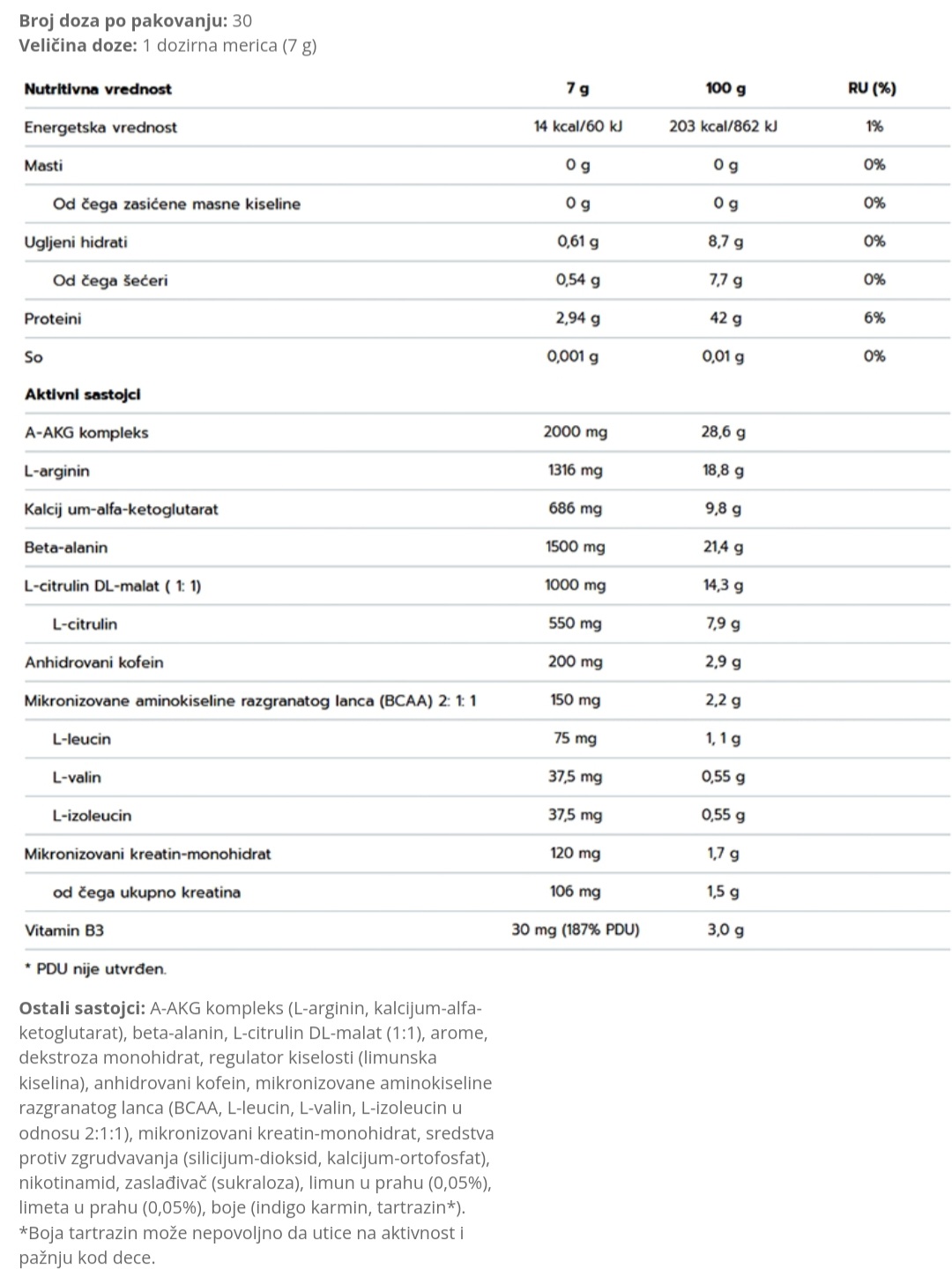 Kreatin se sintetiše u organizmu u količini od 1-2 g, a dodatno se hranom još toliko unese. Prema Encyclopedia of Dietary Supplements i Dietary Supplements početna (udarna) faza je 20 g dnevno (u 4 porcije po 5 g), nakon koje sledi "faza održavanja", za koju su karakteristične doze od 3-5 g kreatina dnevno. Niacin doprinosi normalnom metabolizmu stvaranja energije, normalnoj funkciji nervnog sistema, normalnoj psihološkoj funkciji, održavanju normalnih sluznica, održavanju zdrave kože, smanjenju umora i iscrpljenosti. Pakovanje: 210 g Preporučena upotreba: Kao dodatak ishrani, izmešati jednu dozu od 7 g (2 merice) proizvoda sa 250 ml hladne vode i konzumirati 30 minuta pre početka aktivnosti.