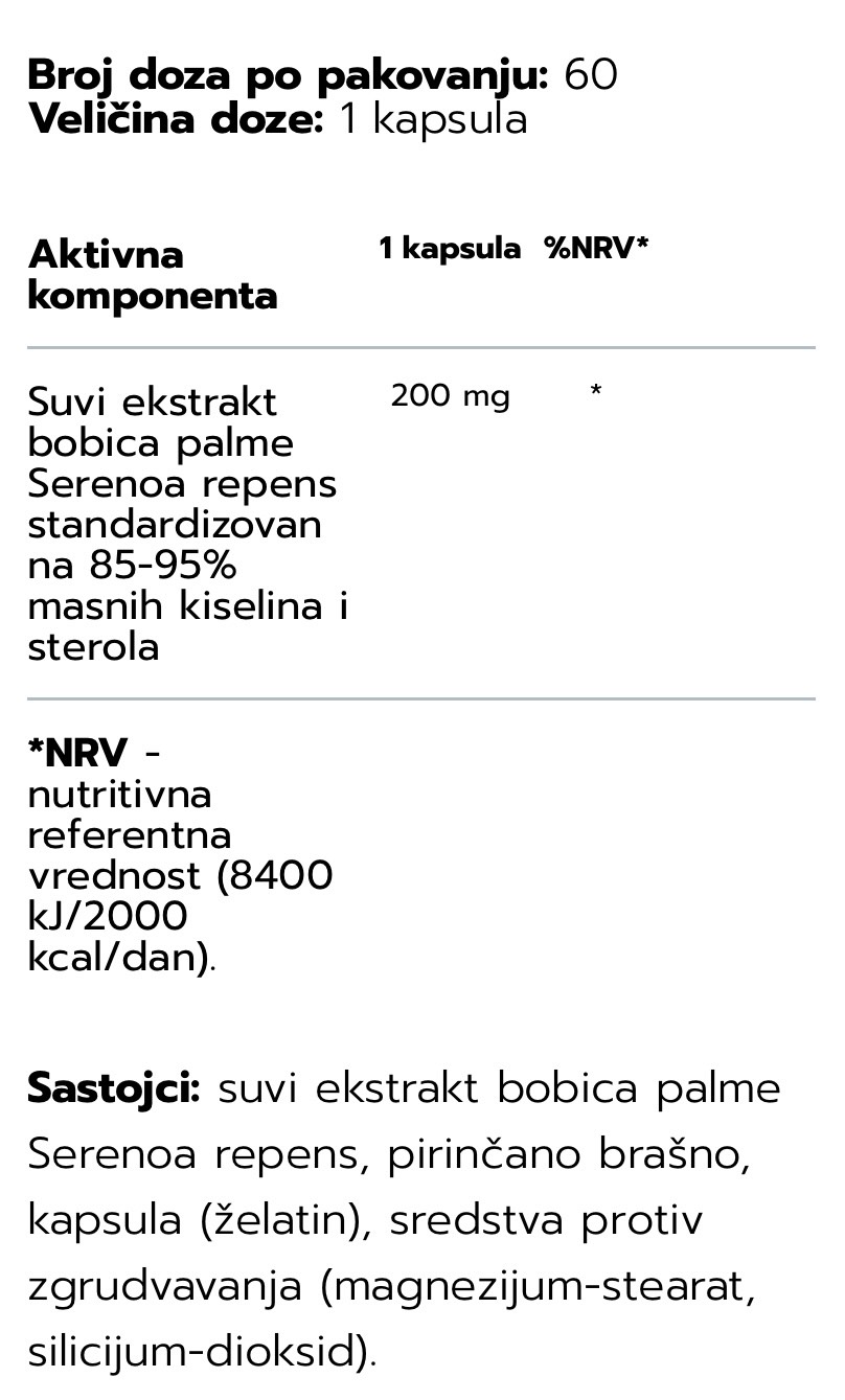 Za porudžbine preko 6.000 RSD *BESPLATNA DOSTAVASaw Palmetto ili testerasta palma (lat. Serenoa repens) je biljka poreklom iz Severne Amerike. Domoroci na Floridi su koristili njene bobice još pre nekoliko vekova u ishrani, a kasnije su je Indijanci prihvatili kao lekovitu biljku. Korišćena je kao tonik, sirup za iskašljavanje i antiseptik.