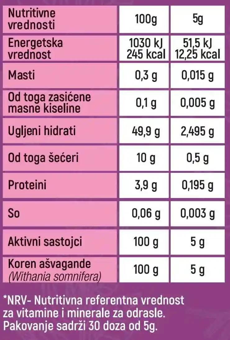 Sastojci: 100% organski koren ašvagande u prahu (Withania somnifera) iz Indije. Pakovanje traje oko 5 nedjelja. Organska Superior indijska ašvaganda u prahu direktno sa plantaže iz najplodnijeg dela Indije koji je pod Unesco zaštitom. 100%  je čista ašvaganda kontrolisana duplim analizama od isključivo celog korena A klase. Upečatljivo intenzivan ukus koji joj daje u potpunosti očuvana bioaktivna jedinjenja, odgovorna za njena neverovatna zdravstvena svojstva. Prirodno ne sadrži gluten ali nije sertifikovano bezglutenski.