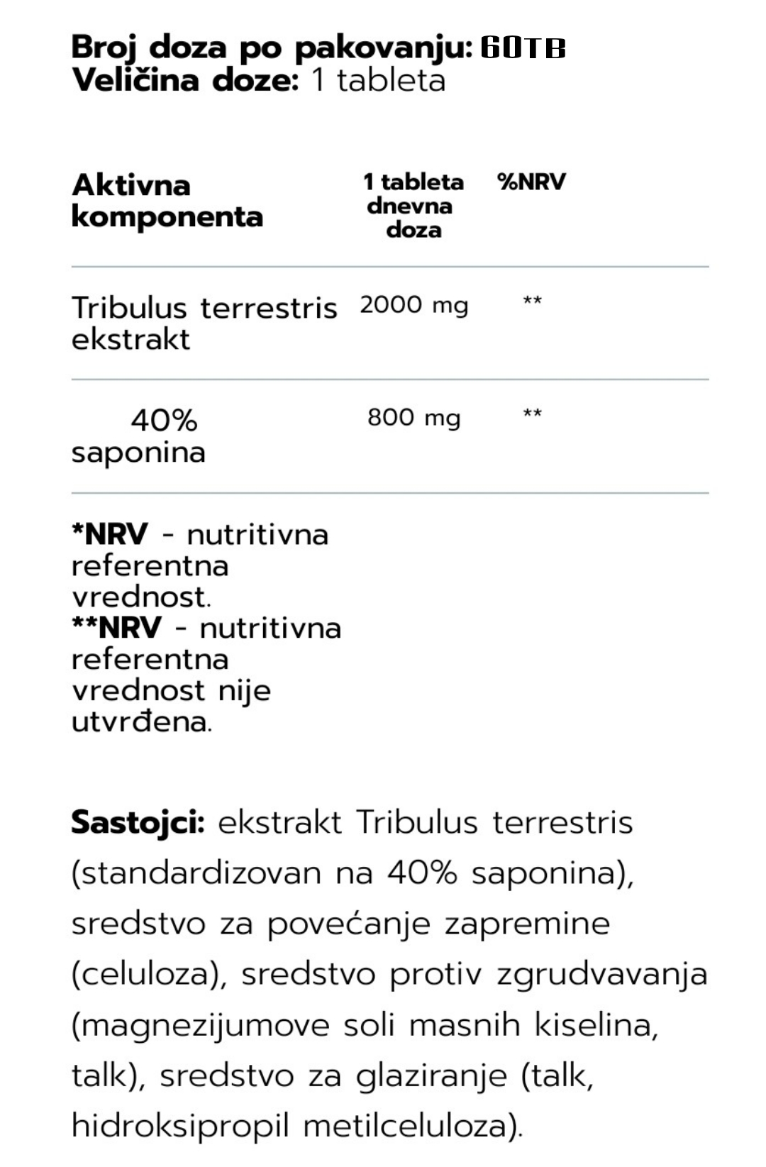 Za porudžbine preko 6.000 RSD *BESPLATNA DOSTAVATribulus (lat. Tribulus terrestris, babin zub, zubačica) je jednogodišnja zeljasta biljka iz familije Zygophyllaceae. Rasprostranjena je u sušnim i suptropskim predelima južne Evrope (i na Balkanu), Azije i Severne Amerike. Tradicionalno se koristila za lečenje impotencije i kao tonik za podmalađivanje, a danas je veoma popularna među sportistima, bodibilderima i atletičarima kao prirodni anabolik.