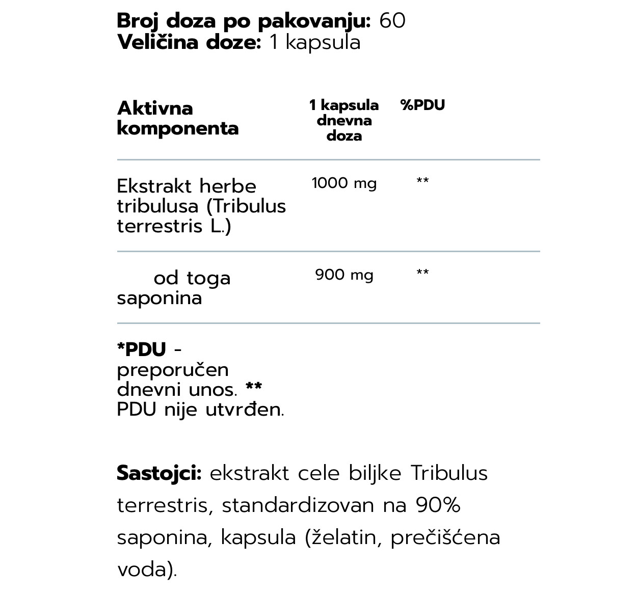 Sastojci: ekstrakt cele biljke Tribulus terrestris, standardizovan na 90% saponina, kapsula (želatin, prečišćena voda).