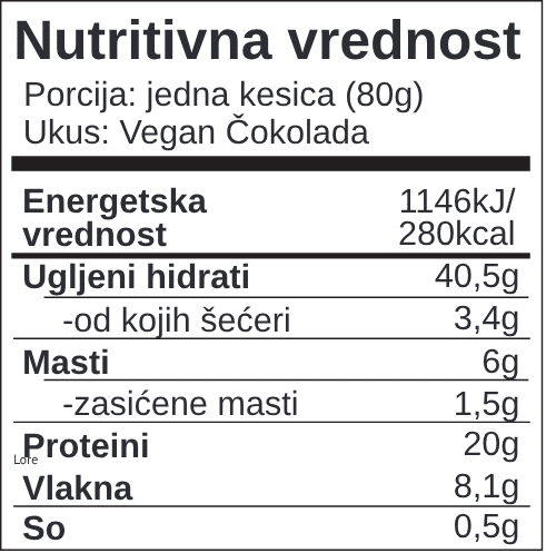 Pripremanje vegan proteinske kaše: Sadržaj kesice preliti sa 100-200ml tople vode ili mleka. Smesu promešati i ostaviti da stoji 2-3 minuta. Proizvod može sadržati tragove kikirikija i mleka.