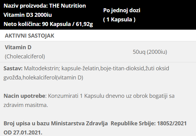 Za porudžbine preko 6.000 RSD *BESPLATNA DOSTAVAVitamin D3 2000i.u. od brenda "The Nutrition" je kvalitetan dodatak ishrani koji ima za cilj da zadovolji vaše dnevne potrebe za ovim esencijalnim nutrijentom. Ovaj proizvod je posebno dizajniran da obezbedi optimalnu dozu vitamina D3, čime doprinosi održavanju vašeg opšteg zdravlja. Vitamin D3 je izuzetno važan za naš organizam, poznat po tome što doprinosi zdravlju kostiju i zuba. Podržava rad mišića i imuniteta, a takođe igra ključnu ulogu u procesu deljenja ćelija. Međutim, sunčeva svetlost je primarni izvor vitamina D za većinu ljudi, što može biti problematično tokom hladnijih meseci ili za ljude koji provode veći deo vremena unutra. Suplementacija Vitaminom D3 2000i.u. od "The Nutrition" obezbeđuje konzistentan i dovoljan unos ovog ključnog vitamina. "The Nutrition" je brend posvećen proizvodnji najčistijih, najkvalitetnijih suplemenata. Vitamin D3 2000i.u. nije izuzetak - ovaj proizvod je proizveden u skladu sa najstrožim standardima kvaliteta, osiguravajući da dobijete čist i efektivan proizvod.