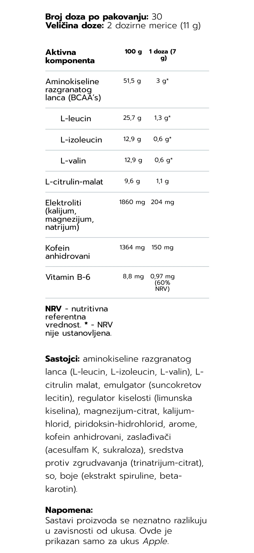 Ovakav sastav predstavlja prirodnu podršku za dodatnu energiju tokom treninga. Odnos aminokiselina BCAA je 2:1:1 (L-leucin, L-izoleucin, L-valin). Aminokiseline su neophodna gradivna materija za stvaranje mišićne mase, sprečavaju razgradnju, pucanje i trošenje mišića za dobijanje energije, ubrzavaju i učestvuju u kvalitetnom njihovom oporavku od treninga i fizičkog napora uopšte. L-citrulin DL-malat je aminokiselina čija je glavna karakteristika sposobnost da poveća fizičke performanse podizanjem energetskih nivoa u ćeliji što utiče i na snagu i na intenzitet treninga u najpozitivnijem smislu. Ubrzava oporavak mišića nakon treninga, smanjuje bol i upalu i stimuliše cirkulaciju. Jabučna kiselina (malat) upotpunjuje delovanje citrulina i stimuliše cirkulaciju čime se povećava dotok kiseonika u mišiće, a to rezultuje povećanjem izdržljivosti i efikasnosti.