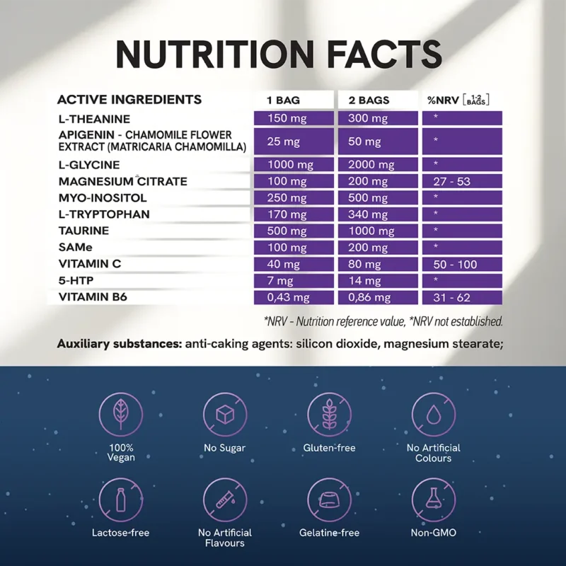 Preporučena upotreba: Rastvoriti 1-2 kesice u 200 ml vode i popij 30-60 minuta pre spavanja. Za koga je Zzzuper Sleep idealan?